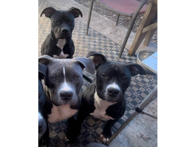 Update: I still have one female and two males available. These bully pups are 7 months old and absolutely stunning. I am rehoming them on behalf of my 17-year-old son due to personal family matters. Out of the litter, I have already found homes for two and decided to keep two for myself. The remaining female is black and white, while the other three are males. These pups are already weighing over 40 lbs at such a young age. It is important that potential adopters have experience with the bully breed, as I want to ensure these sweet babies do not end up in a shelter. They have been raised in my home, surrounded by other dogs and people, as their mother was relocated from the east coast. We provide them with a high-quality food kibble mixed with raw. To cover the expenses of food and relocation, as well as to ensure they find good homes, I am asking for a $400 rehoming/adoption fee. My main goal is to find these amazing dogs new homes and prevent them from ending up in a shelter. Although I would love to keep them all, I already have three adult bullies.