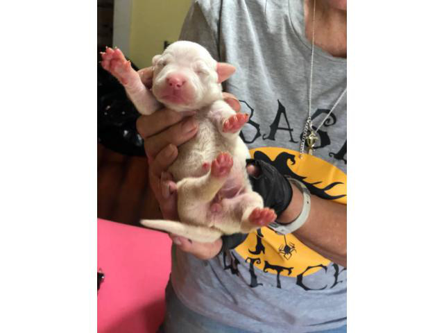 I've three boys and seven girls fullblooded pitbull puppies who will be ready to leave for about 4-5 weeks! Mom is all white Pit, dad is red nose pit. Asking for $300.