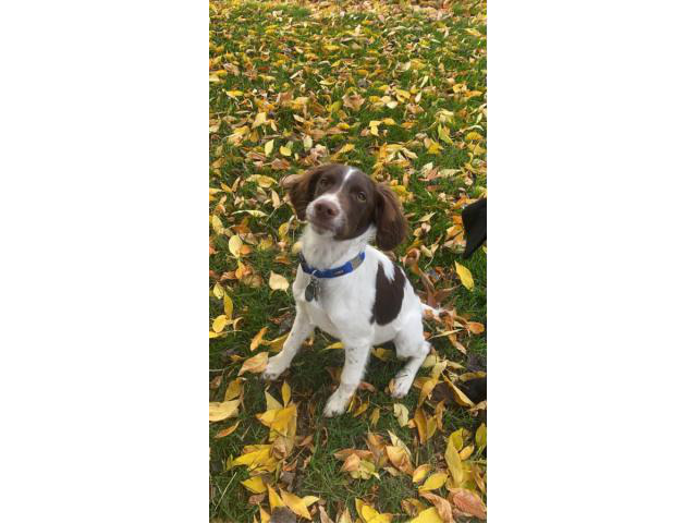 Male Brittany spaniel puppy looking for a good home. He is 5.5-month-old. Microchipped and up to date on shots. Potty trained and crate training done! Knows the basic commands A neuter contract will be required, as well as another contract to ensure he goes to a good family. Please only message me if you are serious with giving him a new home.