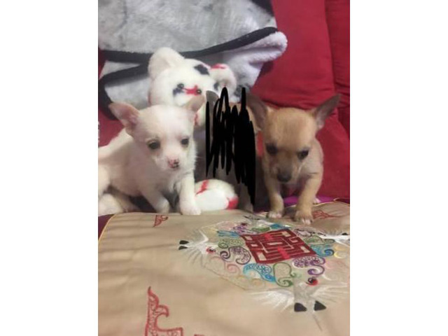 We have 2 male chihuahua puppies born November 12 2017 been dewormed been with us other animals and youngsters implementing paper training them eating puppy chow all weigh 1 pound 6 oz to up-and-coming small to have shots yet however do have the pup shot to give them I will meet txt or call to find out more