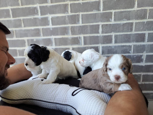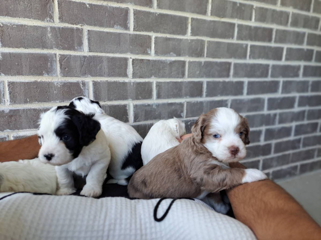 We have Toy/Mini Cockapoos, which are a mix of American Cocker Spaniel and Toy Poodle, and they're known to be VERY LOW SHEDDERS! Let us tell you about the parents, Mama is a 2-year-old Parti Merle Toy Cockapoo who is a loyal companion, fearless yet gentle, playful, and intelligent. Her coat is absolutely stunning with unique merle grey patches and one partially blue eye. Dad is a 1-year-old Parti Mini Cockapoo, who is a soft, muscly teddy bear with piercing light blue and deep hazel colored eyes. We're thrilled to announce that on Feb 8th, 2023, Mama delivered 5 healthy pups, 4 males, and 1 female. The pups' estimated mature weight is around 15lbs and they're already showing unique and rare coat traits. We have 2 male pups with stunningly bright blue eyes, one Albino with a completely white coat, and another with a gorgeous brown and white merle coat. The female pup is the smallest but is feisty and growing quickly. Our pups are on a strict diet and are currently being weaned to eating homemade puppy mush. We've been gently handling them, and our tiny additions have been great with our 3 & 6-year-old boys. Please keep in mind that the pups will require upkeep and routine maintenance. If you're interested in meeting them, please text or email us for more information. We can't wait for them to find their forever homes!