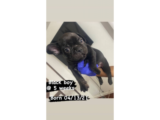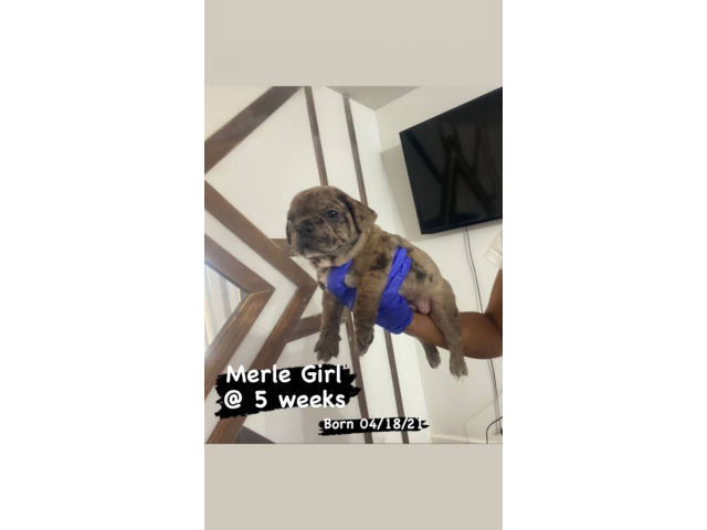 Puppies born on 04/18/21 are stunning French Bulldogs. One Merle female, one Blue male, one Merle boy, and one Black male with a few tan spots were registered with the AKC. They will be available for new home On 06/13/21. Please do not hesitate to contact me if you have any questions.