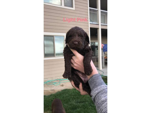 5 chocolate and 6 black gorgeous baby Labradoodles. Father is standard poodle registered with AKC. Mother is a chocolate lab registered with AKC. Mother is on the location, fantastic hunter, loves playing fetch, loves water, great with children. Puppies are well conditioned, raised with our seven kids. Ready for a new home on May 18. Please call or text for any question.