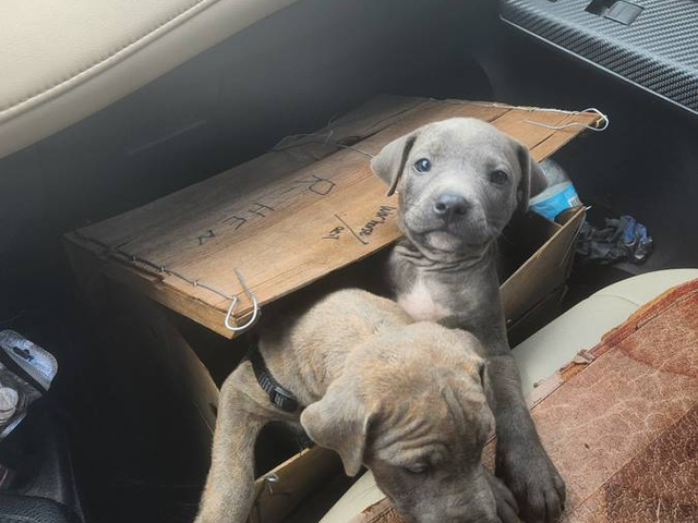 Two 9-week-old puppies, Silver Lab and American Stratford Terrier mix. They are female siblings, with one having a silver coat and steel grey/blue eyes, and the other being brindle with steel/blue eyes. The owner wants them to stay together as they are very loved and have great personalities. They have received their first shots and have been dewormed. Contact Greg to purchase the pair for $300, without papers. Both parents were present at the birth site.