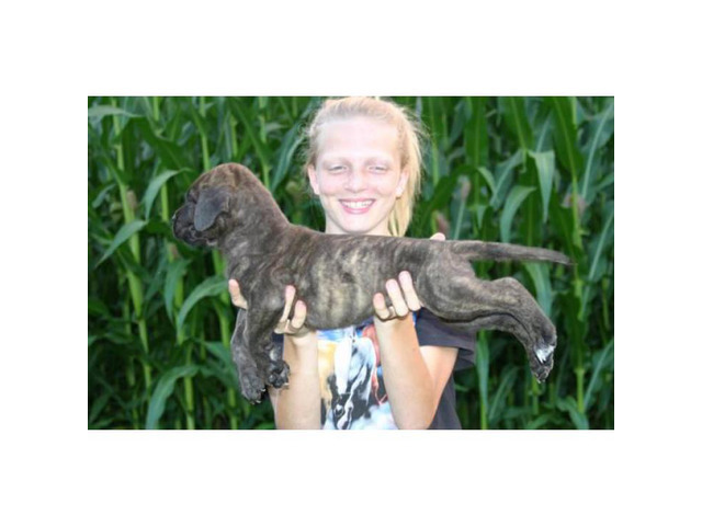 3 Brindle Males Mastiff Puppies for Sale. Pups born May 28. Father and mother are family pets on our country farmhouse, and on site with all the pups. Both mom and dad (also pictured) are healthy, sweet-natured and well-mannered, social, and good with children and other animals (dogs, cats, chickens, ducks, and horses). Although it is not needless or excessive barkers, they're intimidating watch dogs because of their imposing size, powerful looks, and self-assurance. We insist prospective adopters are willing and able to supply loving, responsible, forever homes able to meet the requirements of these big dogs. Please research breed information for care and suitability. Re-homing fee to pay for first shots and demonstrate your serious resolve for providing an excellent home to your puppy. Sincere inquiries only. No texts, please - I can't receive texts will not respond. Please call me for information. Thank you.