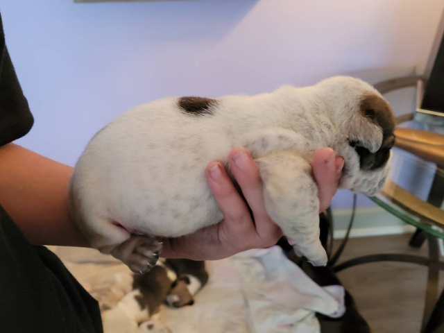 5 tricolor Olde English Bulldogge puppies for sale