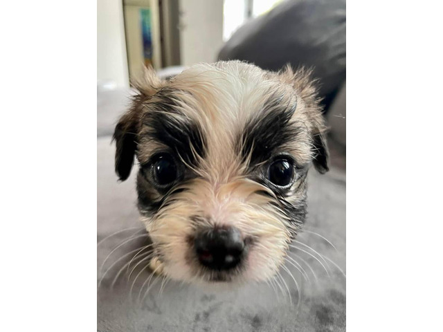 5-week-old Shichon puppies! They are being socialized at home with 2 adult dogs and 2 children. They are doing great with potty pad training. They eat dry food and drink water, and also receive some nursing. They have received all necessary veterinary checks, vaccines, and deworming.